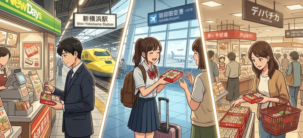 直営店以外でも、崎陽軒のシュウマイ弁当を取り扱っている場所は数多く存在します。特に駅構内の売店は、移動中にさっと購入できるため非常に便利です。